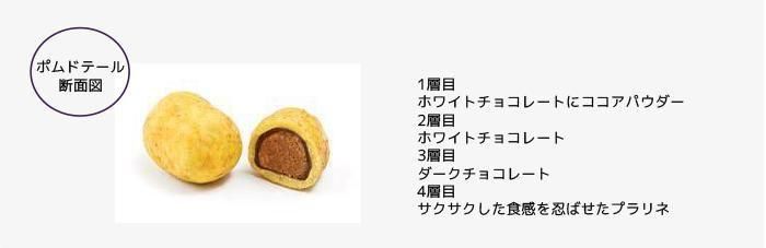 まるで本物のじゃがいもを再現したようなユーモア溢れるショコラ。 ホワイトチョコレートの中にダークチョコレートの層を重ねシャリシャリ食感が新鮮な味わい。